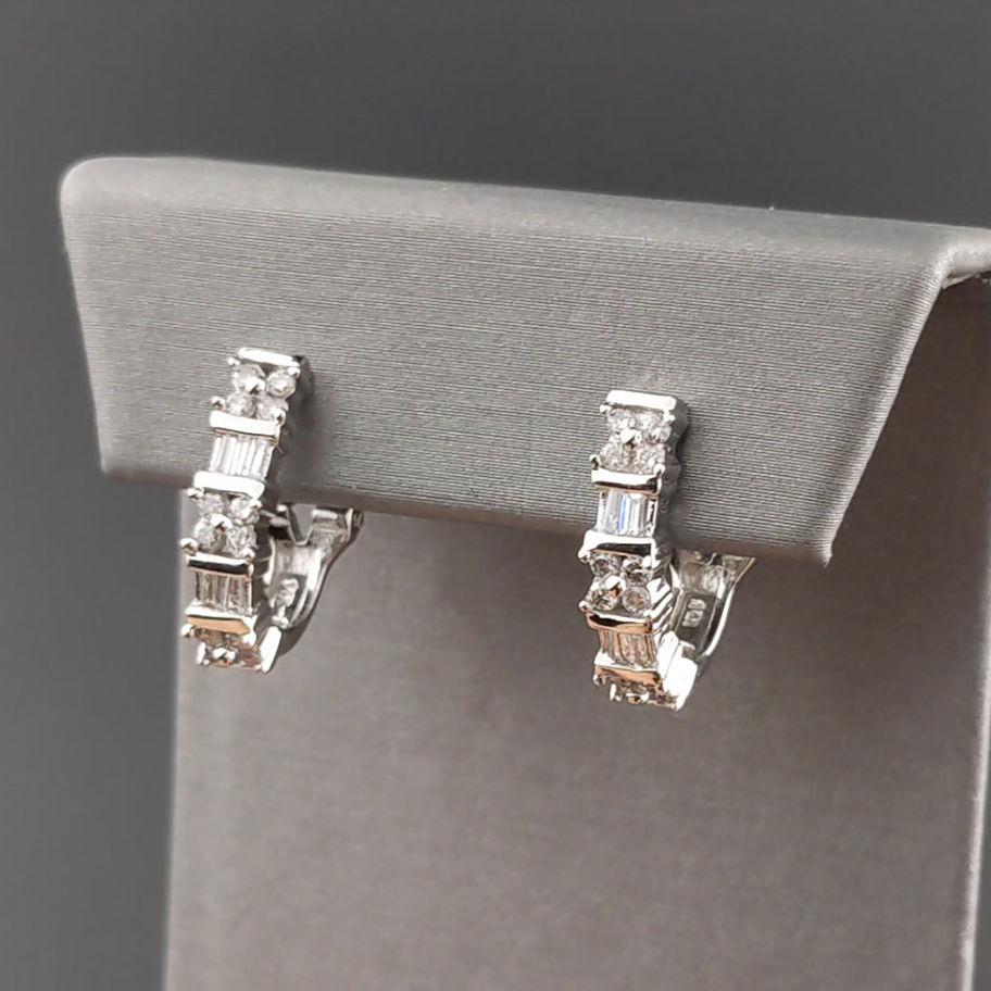 14K white gold hoop earrings, featuring round shaped diamonds and baguette cut diamonds alternating.