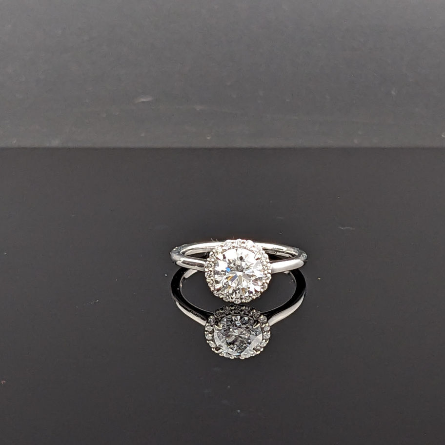 Engagement ring featuring a round shaped lab grown diamond as the center stone with a round shaped lab grown diamond halo.