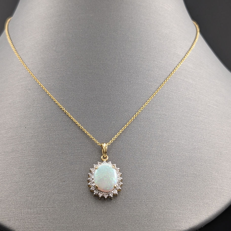 14K White Gold Opal and Diamond Halo Pendant