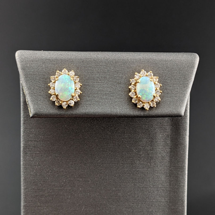 14K yellow gold earrings, featuring an oval cut opal and a round shaped diamonds halo.